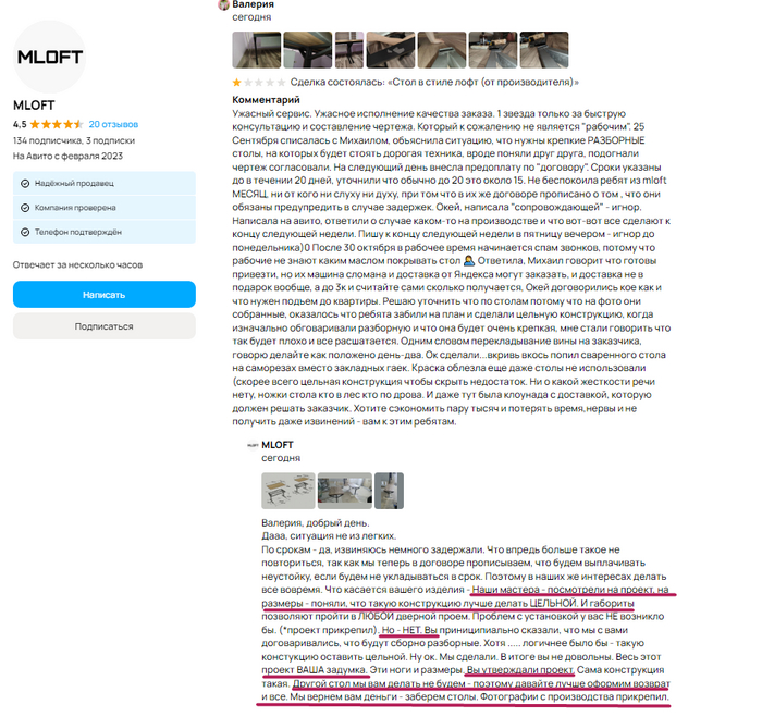 Из всех кандидатов с вариантами разборного стола, попался представить на Авито из MLOFT, консультант Михаил показался очень общительным и заинтересованным в создании проекта. Я объяснила в подробностях что мне требуется, и касаемо того что конструкция должна быть обязательно РАЗБОРНОЙ, и то что столы должны быть крепкими , т.к на них будет стоять тяжелая и дорогая техника. Все это мы подкрепили не однократно словами, и собственно самими чертежами, которые я одобрила и они были "рабочими" и тем что должны были отправится в проект.