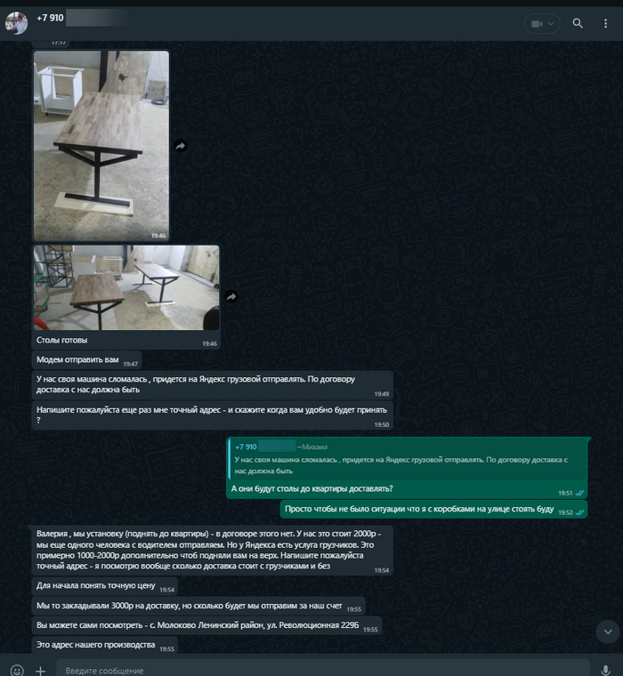 Машина оказывается сломалась. А доставка, которая была сформулирована как "В подарок" оказывается только на 3000р распространяется. И вообще, САМИ СЧИТАЙТЕ сколько там Яндексом выходит и доплачивайте, при том что я не знаю ни габаритов столов, ни их веса, в отличии от работника фабрики.