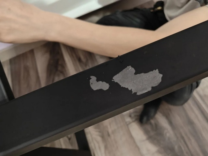 На новом столе, просто шматы краски слезли еще до эксплуатации, если ваш порошок нихрена не держится , положите грунт, что это за проплешины? Это просто ужас, хорошо хоть столешница сверху и это не видно.