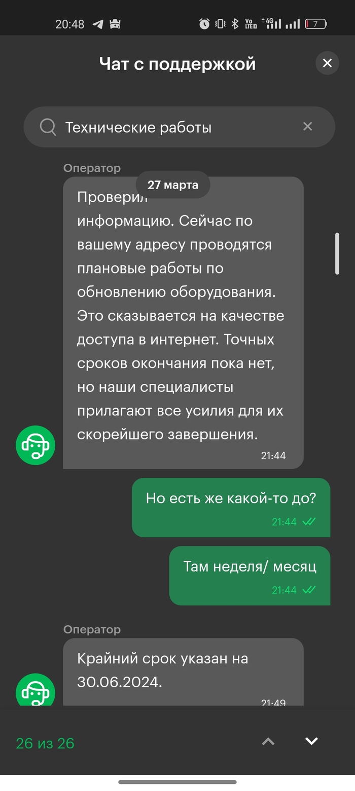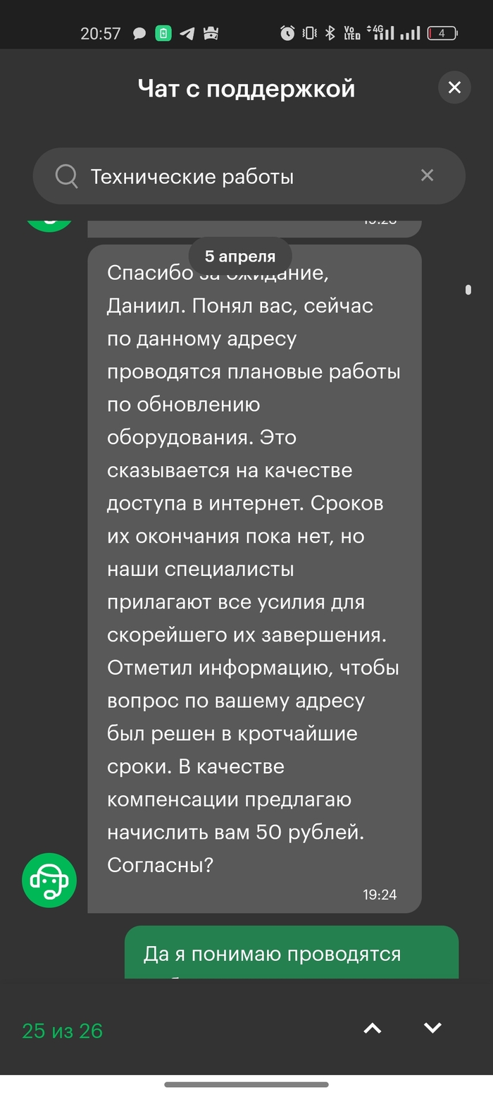 Но мне было недостаточно и я постоянно писал потому что к сожалению провести домашний интернет нет технической возможности. Вот и остаётся данная компания "добра". Но все было хорошо пока однажды они не ушли на технические работы