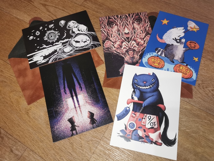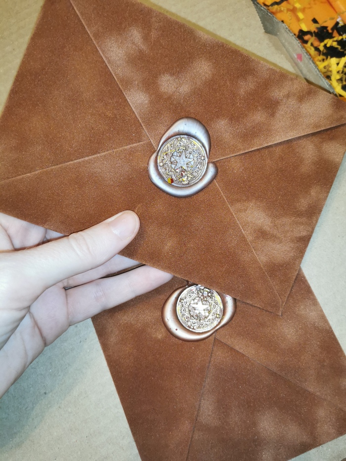 Вельвет! Щупать - не перещупать! Сургуч! С оттском в виде магического круга Сакуры, ловца карт✨ Как же жалко было их вскрывать! Внутри - тематические открыточки. Две слева подписаны, это была моя главная капризная хотелка, указанная в анкете "хочу письмо!!!" :))) За это отдельная благодарность! ❤