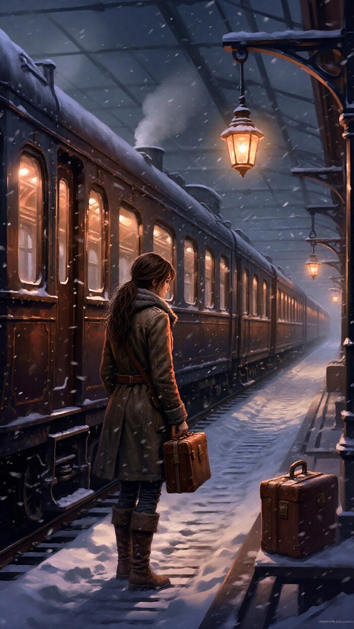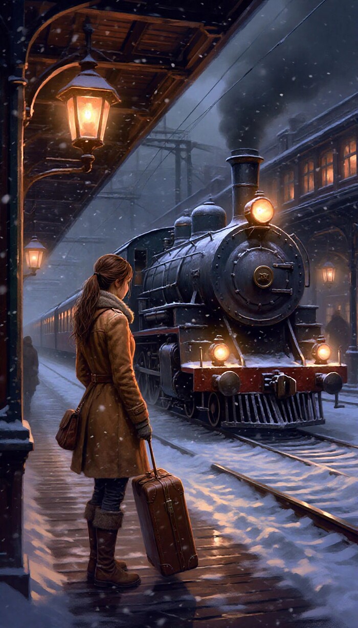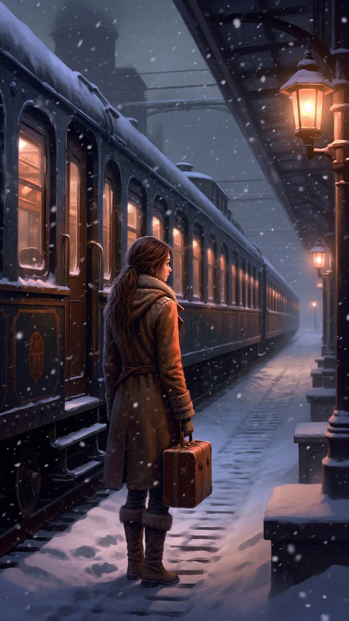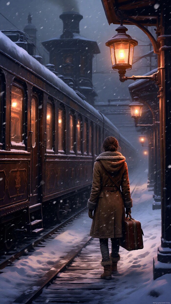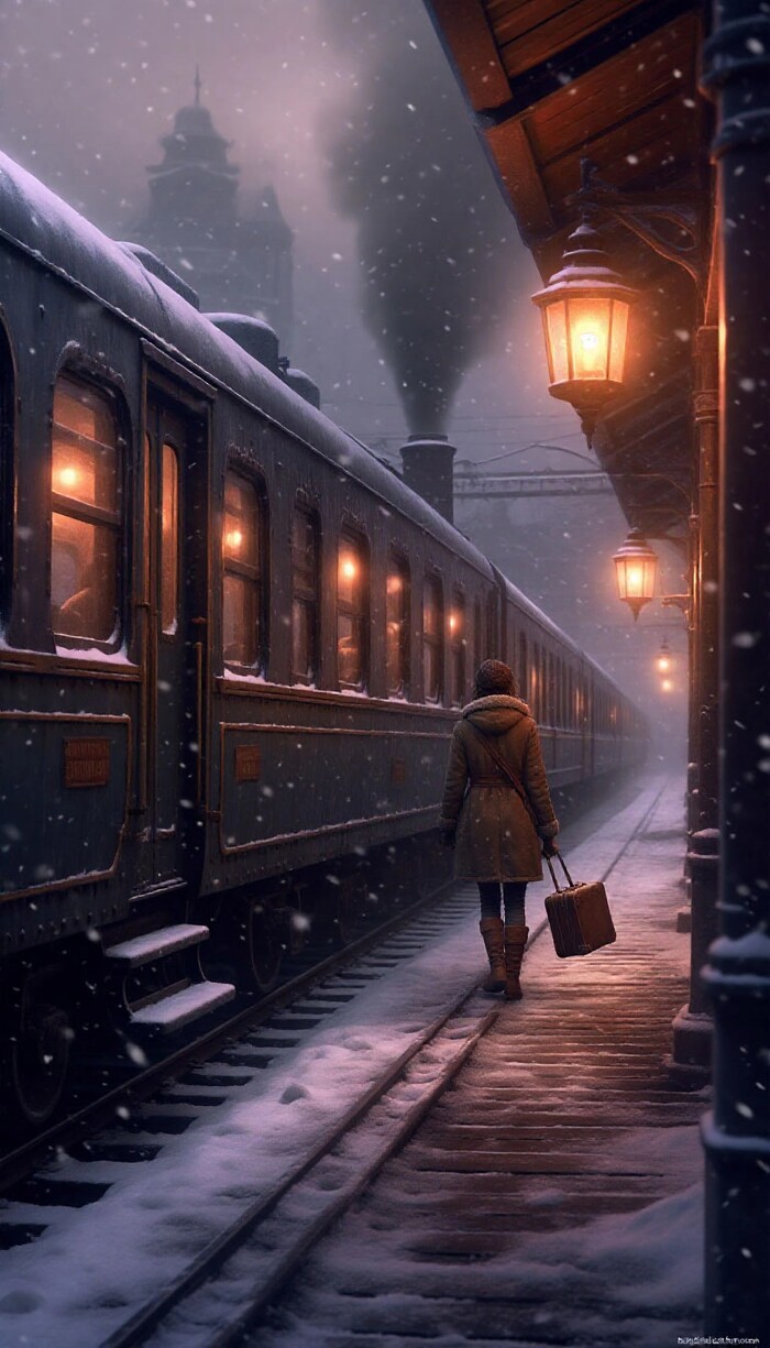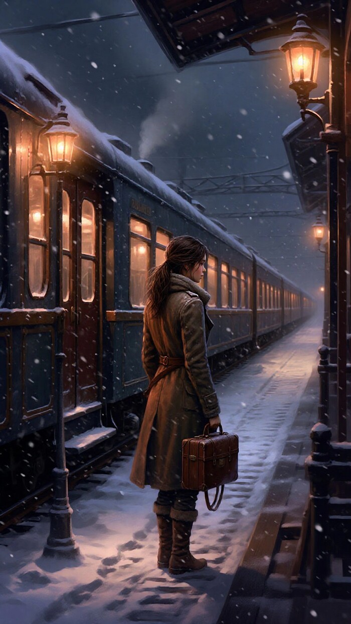 Туманная ночная платформа старой паровой железной дороги, покрытая снегом; наполовину укрытый инеем ретро-поезд с латунными элементами, фонари с тёплым янтарным светом, одна одинокая фигура в тёплом пальто с чемоданом — Кейт Уокер из Syberia в характерном образе, мягкий падающий снег, кинематографическое объёмное освещение, холодная синяя палитра с тёплыми акцентами, высокая детализация, реалистичная текстура металла и снега, глубина кадра, без текста, без водяных знаков.