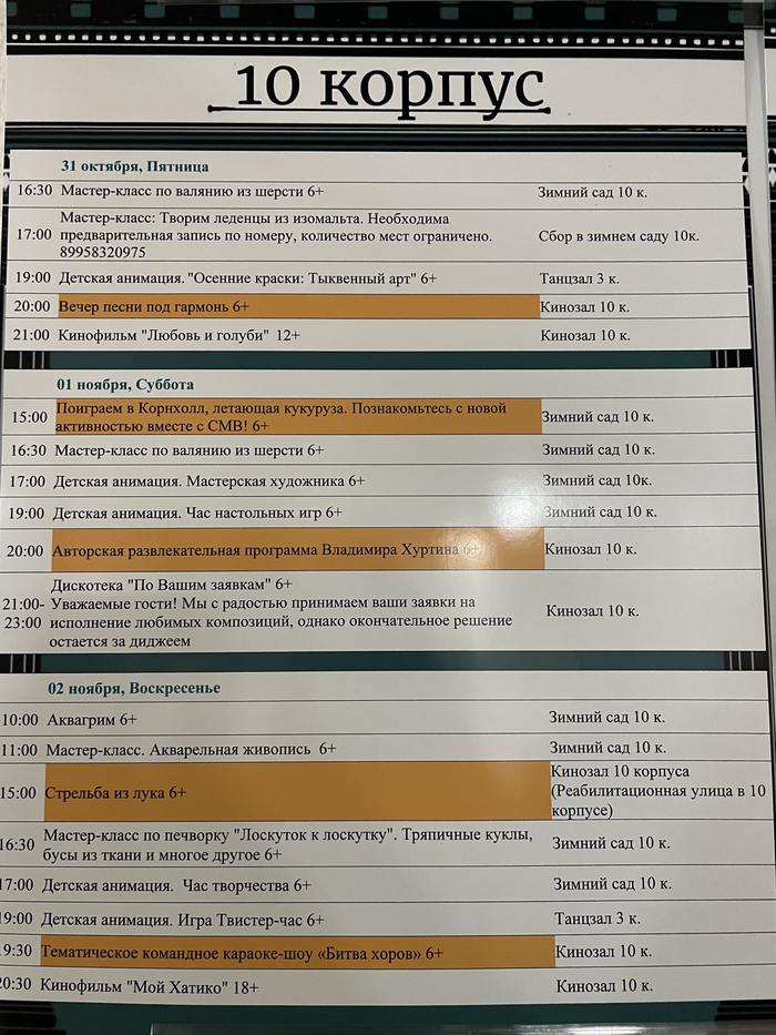 Отдельного внимания заслуживает развлекательная программа. Каждый день было какое-нибудь мероприятие (приложу фото расписания). Из того, что запомнилось мне, — это, однозначно, песни под гармонь, выступление музыкантов со скрипкой и двадцатипятиструнными гуслями, просмотры разных фильмов в кинозале, а также часто были караоке, в которых я всё собирался принять участие, но, увы, стеснение взяло верх. Мама посещала йогу, валяние и даже нарисовала картину.