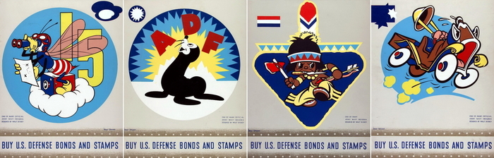 Однако есть в деятельности Диснея в годы Второй мировой один интересный момент, аналогия которому не прослеживается у «коллег по цеху». Художники студии занимались разработкой эмблем для подразделений американских армии, флота, авиации и морпехов. Получалось очень хорошо!