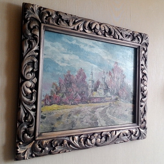 Конечно, картину пришлось подновить, смазать маслом, чтобы она снова приобрела новый насыщенный вид. С рамой пришлось повозиться - долго не могли придумать, какой рисунок выбрать для багета. Остановилось на этом, маме тоже понравился. Теперь моя детская картина украшает мамину комнату.