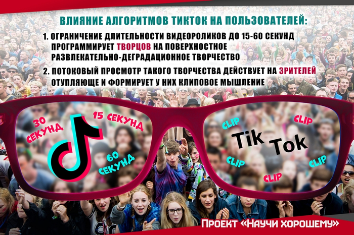 Например, чтобы отупить население, можно на уровне алгоритмов поставить ограничение на объём контента – пусть это будет 30 секунд для видеоролика (вспоминаем ТикТок). Чем более короткий контент, тем более клиповый формат подачи информации. Потребление клипового информационного потока приводит к формированию у пользователей клипового мышления и как следствие – к снижению интеллектуальных способностей. А сокращать общество, состоящее из глупых индивидов, всё же гораздо проще, чем сокращать умных.