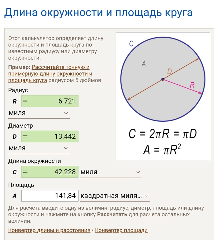 На самом же деле, как говорит нам англоязычная Вики, площадь Лас-Вегаса составляет 141.84 sq ml (367.36 км2). То есть нам необходимо найти в футах длину окружности площадью 141,84 квадратных мили.