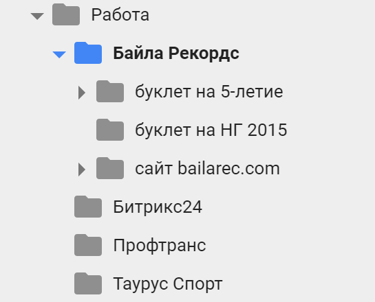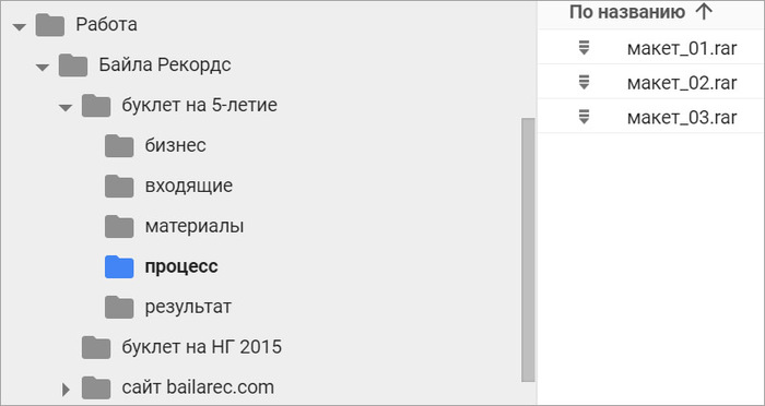 В нашу иерархию можно легко внедрить деление по годам и месяцам. Оно полезно, если проектов много, то есть трудно охватить взглядом список и выделить нужный. Открывая папку «работа» вы видите подпапки с названием в виде года — «2015», «2016» и т. д.