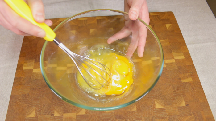 В глубокую миску вбиваем 3 яйца, добавляем 2 ст.л. сахара и пол чайной ложки соли. Перемешиваем смесь. Важно чтобы на этом этапе соль и сахар полностью растворились.
