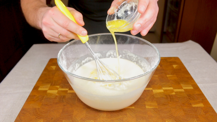 Последним шагом вмешиваем в тесто растопленное сливочное масло и последний раз перемешиваем его.