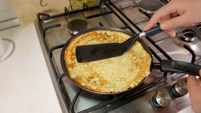 Готовим блин пока тесто не станет матовым и не начнёт темнеть по краям – это верный признак того, что пора перевернуть блин. С обратной стороны жарим блин около минуты и снимаем его со сковороды.