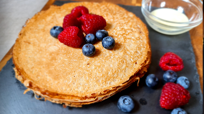 Повторяем эту операцию пока тесто не закончится. Из указанных в рецепте ингредиентов в среднем должно получиться 15 блинов. Сервируйте блины с ягодами, вареньем мёдом и сгущёнки и подавайте к столу. Приятного аппетита!