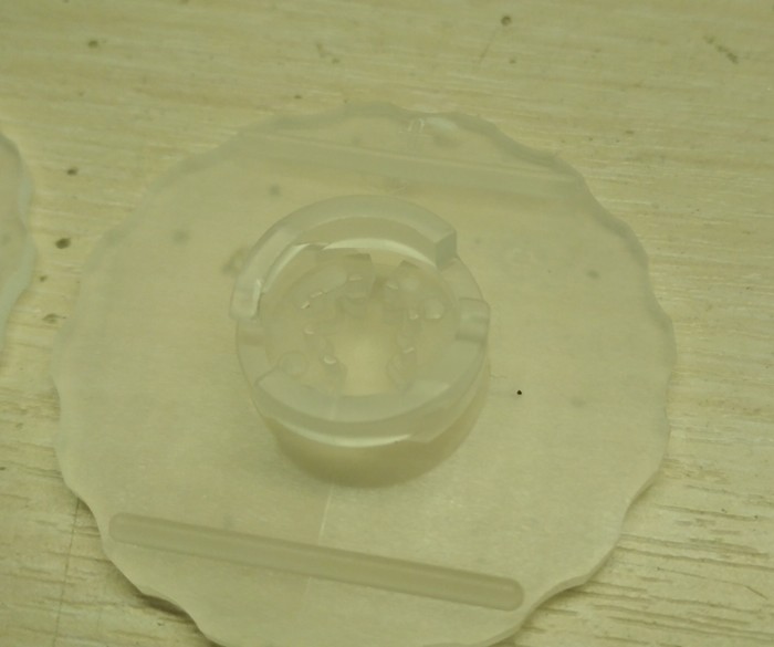 У лицевой половинки, той, что с наклейкой, есть радиально симметричные зубцы. На ответной части 8 небольших стержней. На них и держится линза.