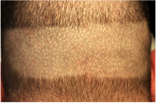 1) Выбривание донорской зоны. Волосы можно брать не только с затылка, а с практически с любой части тела, однако волосы там необходимо сначала сбрить, чтобы хирург мог действовать более свободно(обратите внимание на мелкие рубцы, так выглядит донорская зона с которой уже когда-то брали волосы по методу FUE)