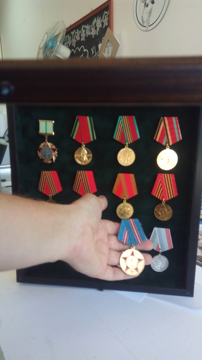 Рама открывается, медали снимаются, особенно дети любят не просто смотреть, а держать в руках разные интересные вещи.