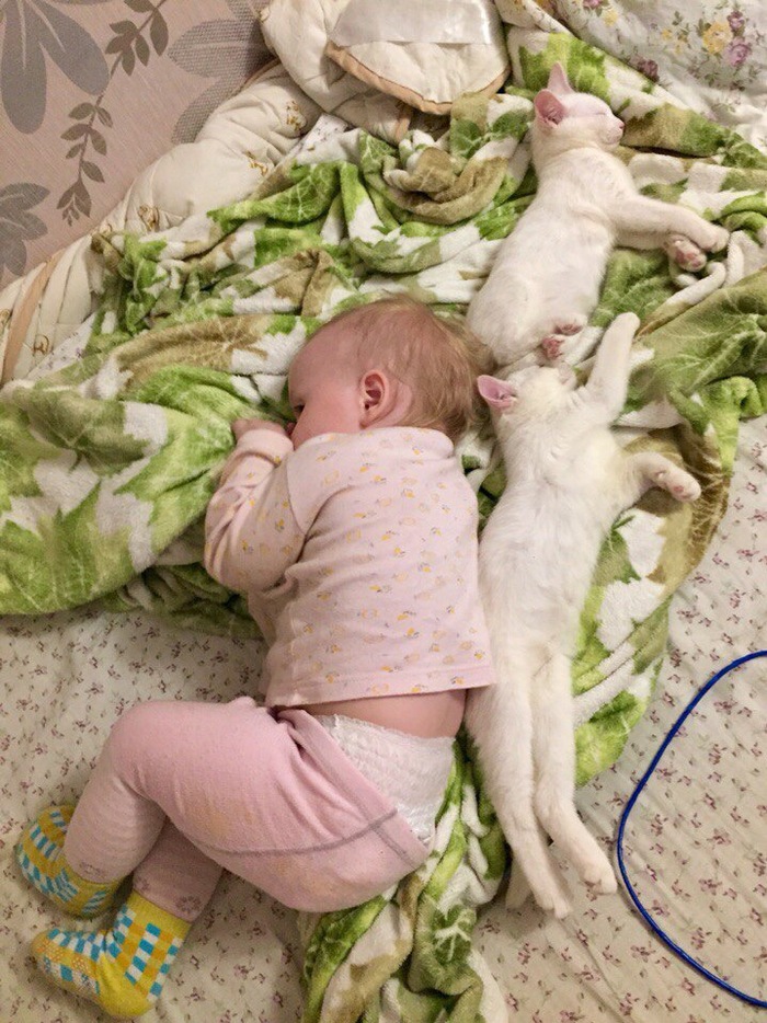 Котят я выкормила сама, месяц бесконечного писка, те кто выкармливал тот знает как это порой не просто сделать, особенно если их 4 штуки и все орут. А с учётом того что дочке тогда было всего 8 месяцев, я стала многодетной матерью кормилицей и у меня бесконечно мелькали перед глазами: бутылочки с молоком, кошачьи морды, подгузники, бутылочки, кошачьи сраные попы и дёргающийся в зеркале мой глаз)))🤪