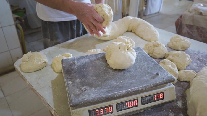 Все работают в очень быстром темпе. Объёмы очень огромные! Пекарь мастерски делит тесто на равные кусочки.