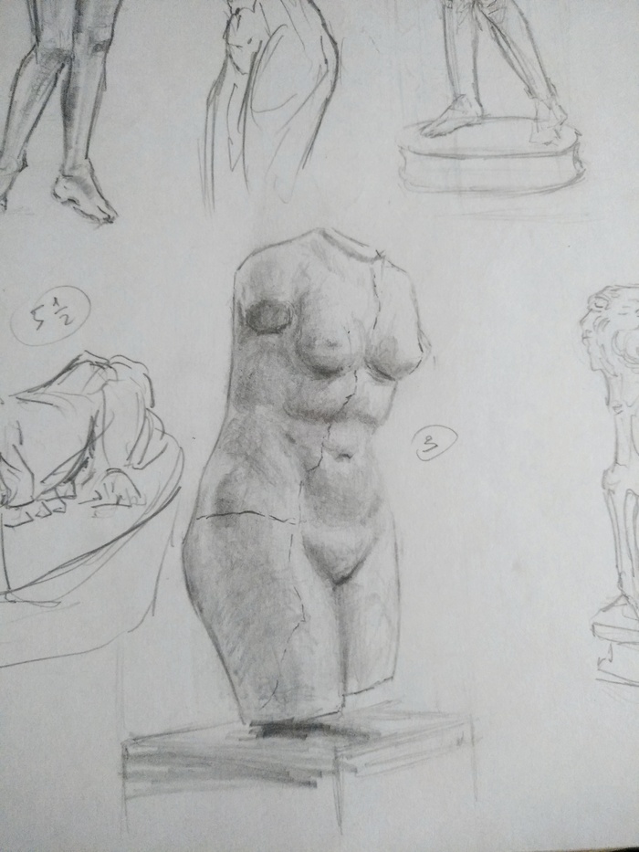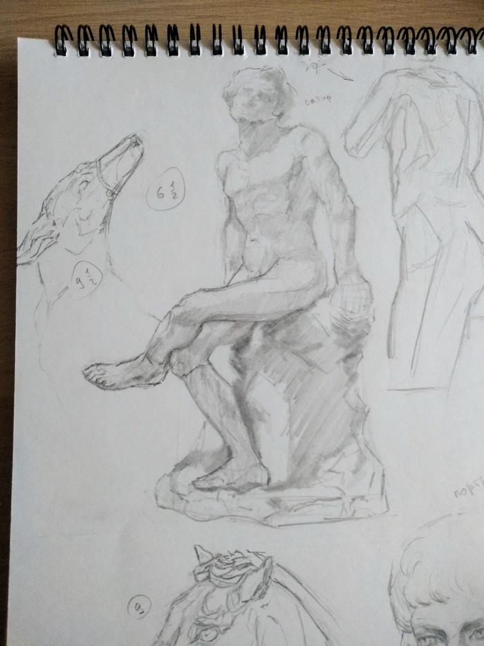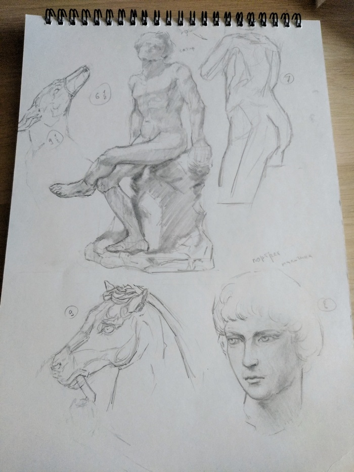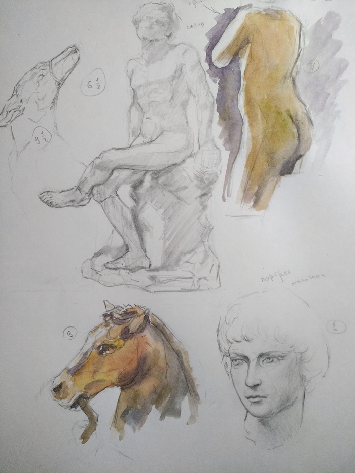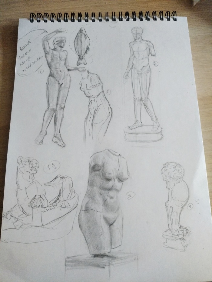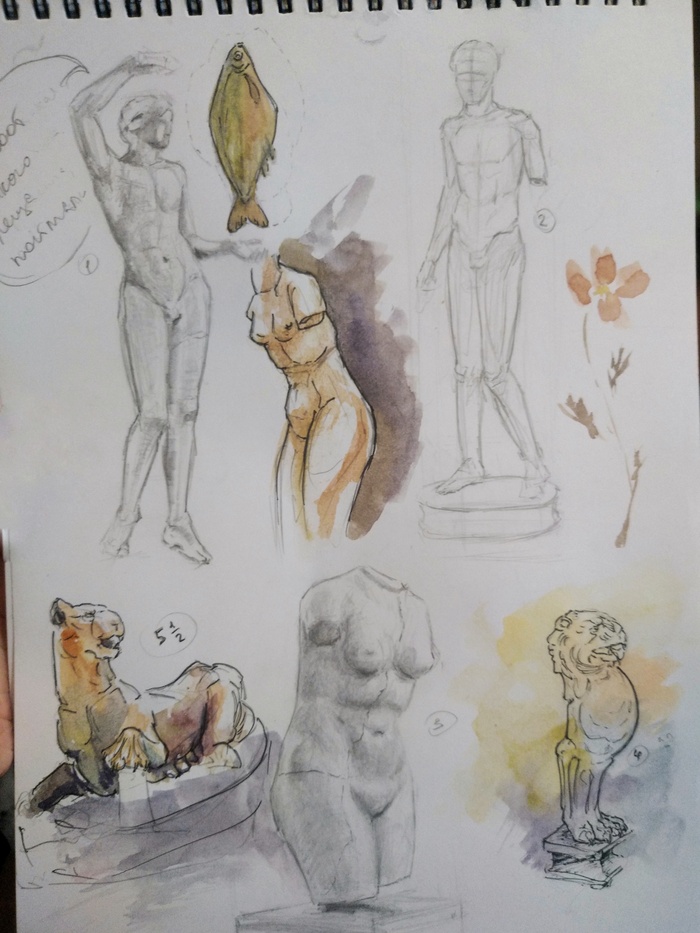 Зарисовки в Эрмитаже. В итоге получилось меньше скетчей, чем при прогулке в Михайловском саду, но тут я больше времени уделял построению и штриховке)
