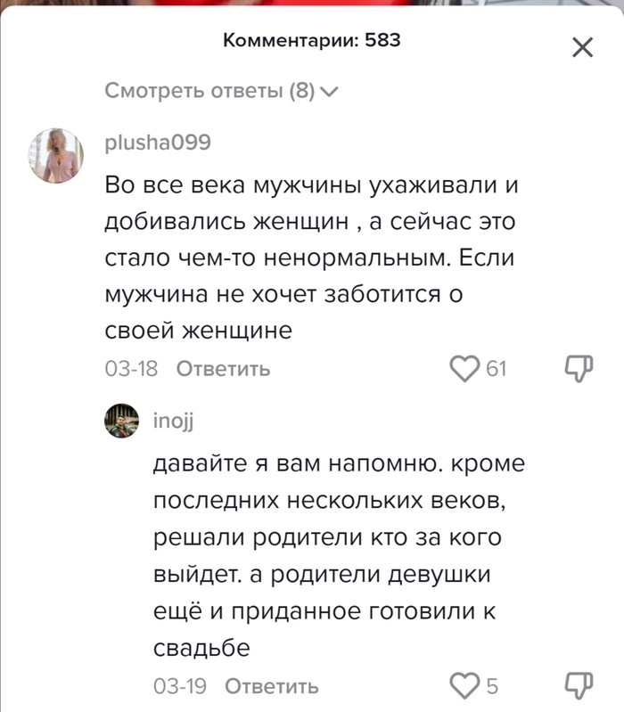Из комментов очередного тиктока про знакомства в сети, где слетелись толпы осуждающих "жадных мужчин"
