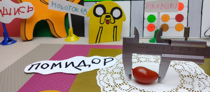 Измеряем самый большой помидор он у нас целых 5.3 см в длину