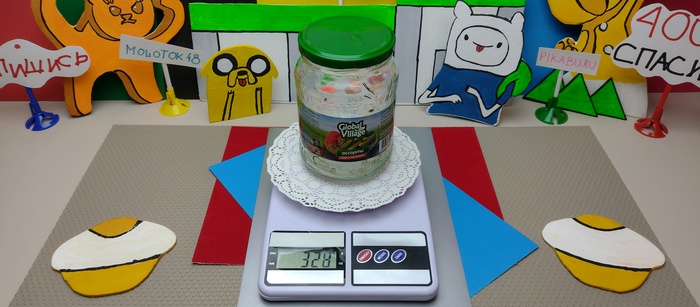 Вывалив всё из банки я решил взвесить совершенно пустую стеклянную банку с крышкой ,её вес оказался всего 328 грамм.
