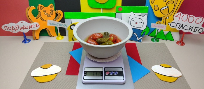Соответственно всё остальное а это рассол, помидоры черри и огурчики корнишоны потянули на целых 711 граммов ! Хотя заявлено всего 680 грамм это очень хорошо.