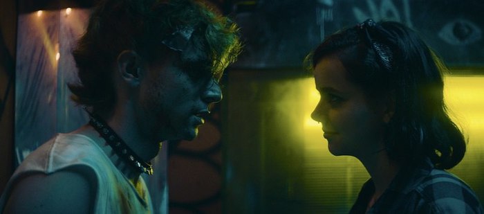 У девушки были ярко-розовые короткие волосы и кольца в ушах. На ней была накинута кожанка с множеством прикрепленных цветных значков. Парень рядом с ней был выше её на голову. Он был тощим и больше напоминал ходячий скелет.