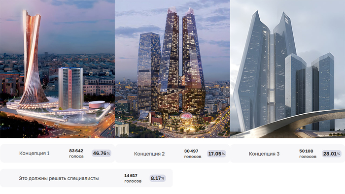 И только один вариант предполагал сохранить здание как есть, но при этом, рядом построить новую коммерческую высотку. Эта концепция и набрала наибольшее количество голосов из всех четырех вариантов — 83 тыс. (около 47%). Вероятно, ее выбрали как меньшее из зол.