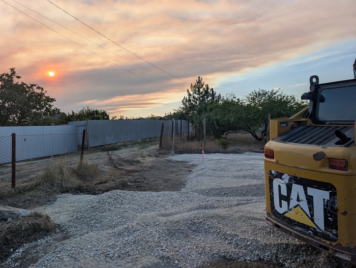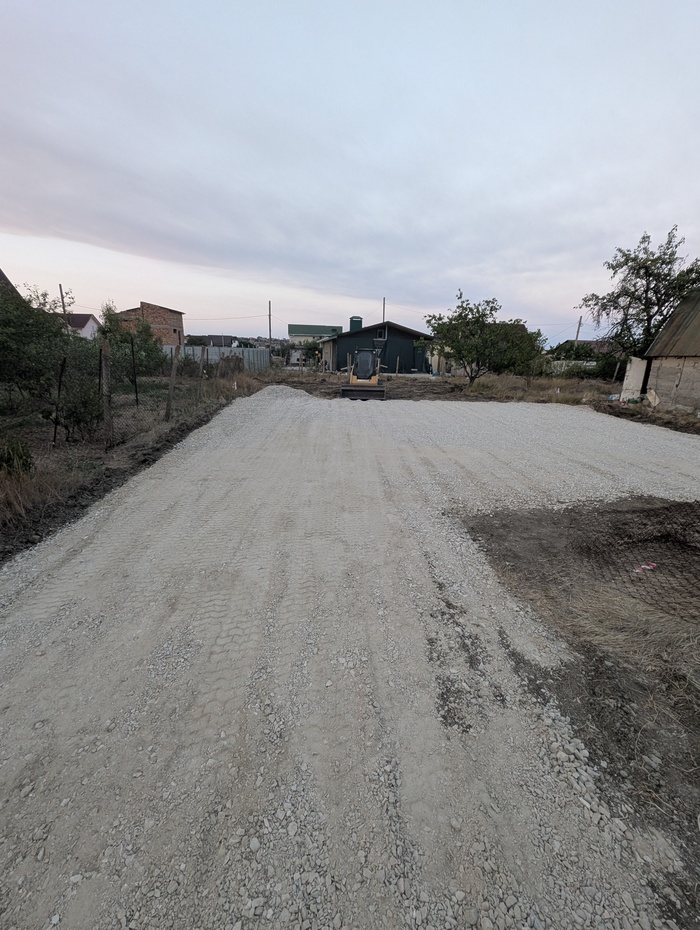 Пока щебень украшает участок, договорился с погрузчиком CAT. За несколько часов он превратил все это в ровную, красивую площадку.
