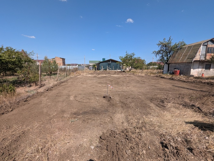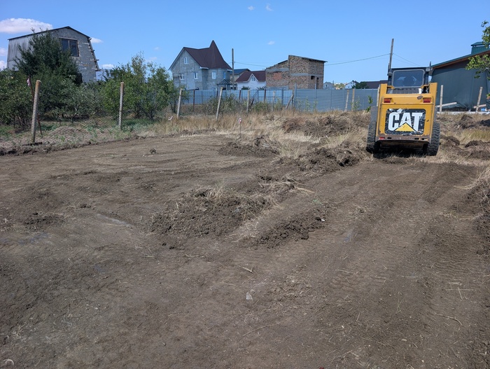 Приступаем к уборке плодородного грунта. Преимущество нашей местности в том, что плодородный слой составляет максимум 15см, а под ним сразу глинозём. Срезанный грунт планируем по участку, выравнивая небольшой углон.