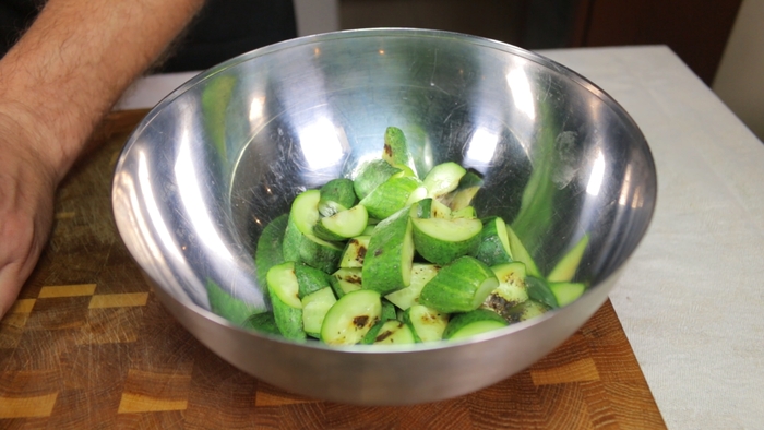 Когда огурцы немного остынут, их надо будет нарезать крупными кусочками. Я предпочитаю делать это поперёк полосок от сковороды гриль, тогда, на мой взгляд они выглядят красивее. Нарезанные огурцы перекладываем в глубокую миску.