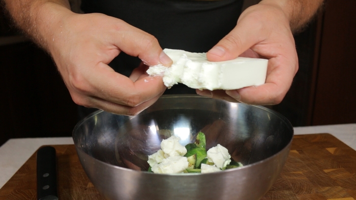 В миску к огурцам отправляем 200 гр сыра сиртаки, предварительно измельчив его руками, до такого состояния, чтобы кусочки сыра были похожи по размеру на кусочки огурцов.