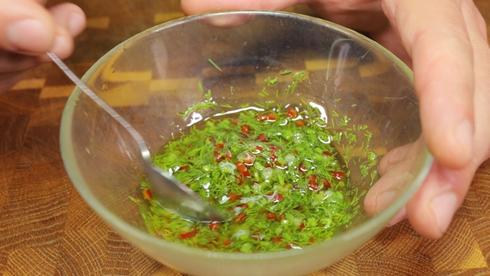 Последнее, что нам осталось сделать - это заправка, а она у салата из жареных огурцов достаточно насыщенная. Для её приготовления берём несколько веточек укропа, буквально 3 штучки и мелко их нарезаем. Перекладываем нарезанный укроп в глубокую миску. К измельченному укропу пропускаем 1 зубчик чеснока через пресс для чеснока. Мелким кубиком нарезаем половинку острого перца чили. Добавляем пол чайной ложки соли и столько же сахара для вкусового баланса. Выдавливаем 2 ст.л. лимонного сока и 4 ст.л. оливкового масла. Перемешиваем всё вместе.