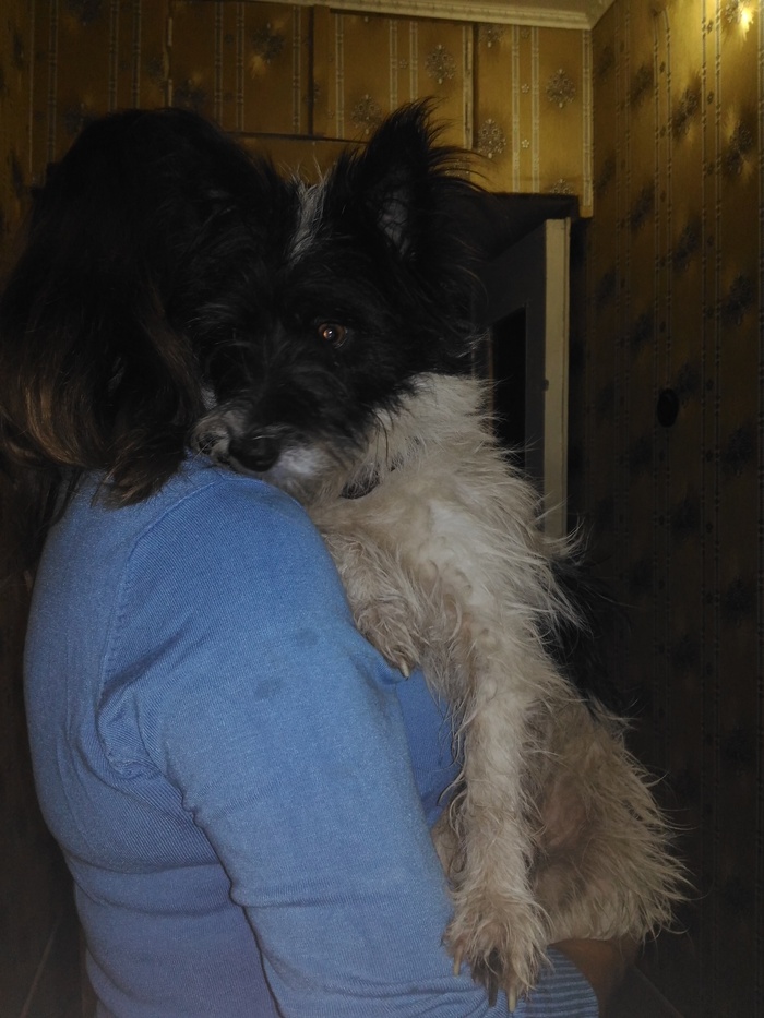 Песик легко идт на руки, хорошо ладит с кошками, да и вообще со всеми. Вроде молодой, вертлявый, сфоткать получилось только так.