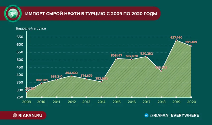 Что касается Турции, то в 2019 году ввоз энергоносителей обошелся Анкаре в 41 млрд долларов, что составляет почти 20% от общего объема импорта (210 млрд долларов), из них 12 млрд долларов пришлись на газ. За первые девять месяцев 2021 года импорт энергоносителей в республику достиг 21,5 млрд долларов (из них 6,3 млрд долларов пришлись на газ), а общий объем составил 193 млрд долларов.