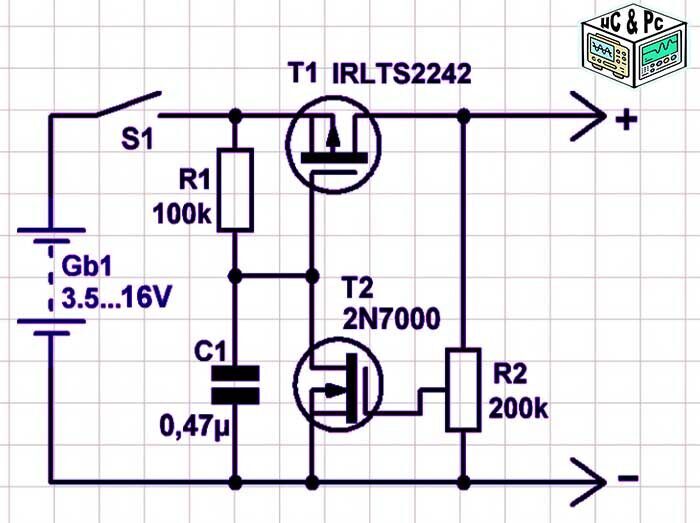 R2 (200 кОм) – Этот резистивный делитель формирует опорное напряжение для правильной работы схемы.Конденсатор (C1, 0,47 мкФ) – Фильтрует колебания и пульсации в цепи, обеспечивая плавное переключение транзисторов и предотвращая случайные срабатывания схемы.