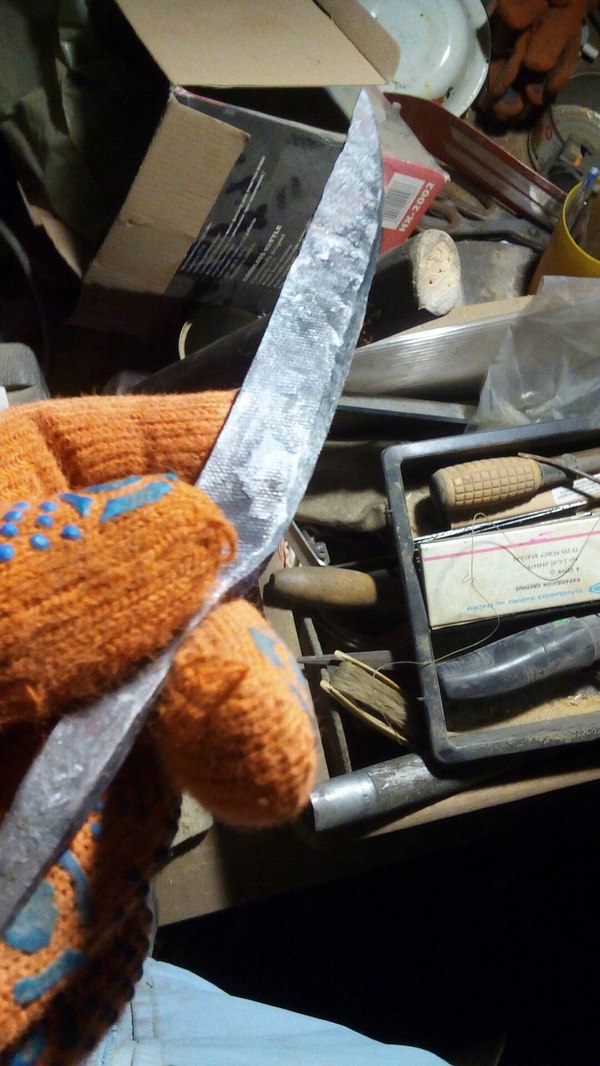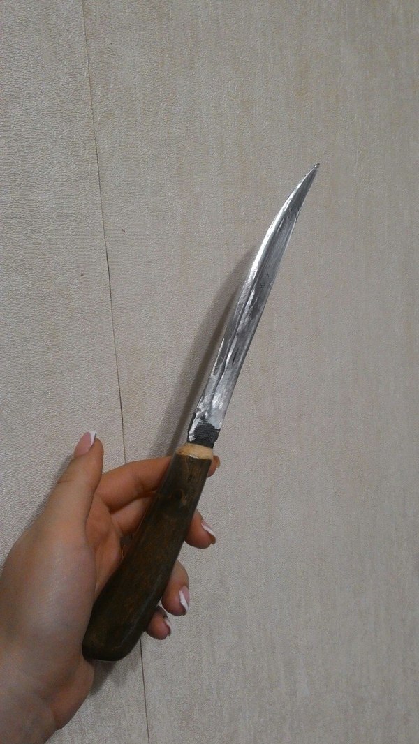 Из чего? Из того, что есть под рукой, разумеется, как и всё остальное. Березовое полено, ими я печку топлю. Взял поленце, отпилил, сколько надо, обтесал топориком до приблизительной формы. А дальше пошла в ход шлифмашинка. Обшлифовал. Подровнял напильником. Ещё немного пошлифовал. Высверлил отверстие под хвостовик обыкновенным сверлом, едва не испортив саму рукоять. И тупо забил рукоять на хвостовик, безо всякого клея, вроде держится. Опять зашлифовал. Подправил спуски. Попробовал заточить. Ну, бумажный лист строгает, но заточка неровная, нужно заточить хорошим бруском. Покрыл рукоять антисептиком, сутки примерно она сохла, потом снова покрыл, просушил и покрыл лаком. Зачистил клинок шкуркой, насколько это возможно. Ну, и собственно на этом работа завершена.