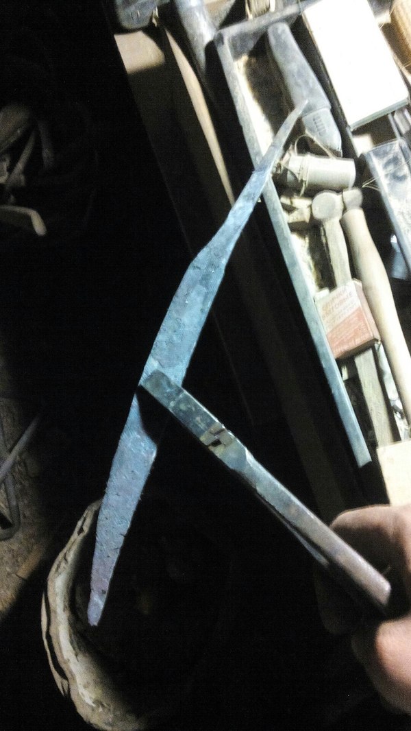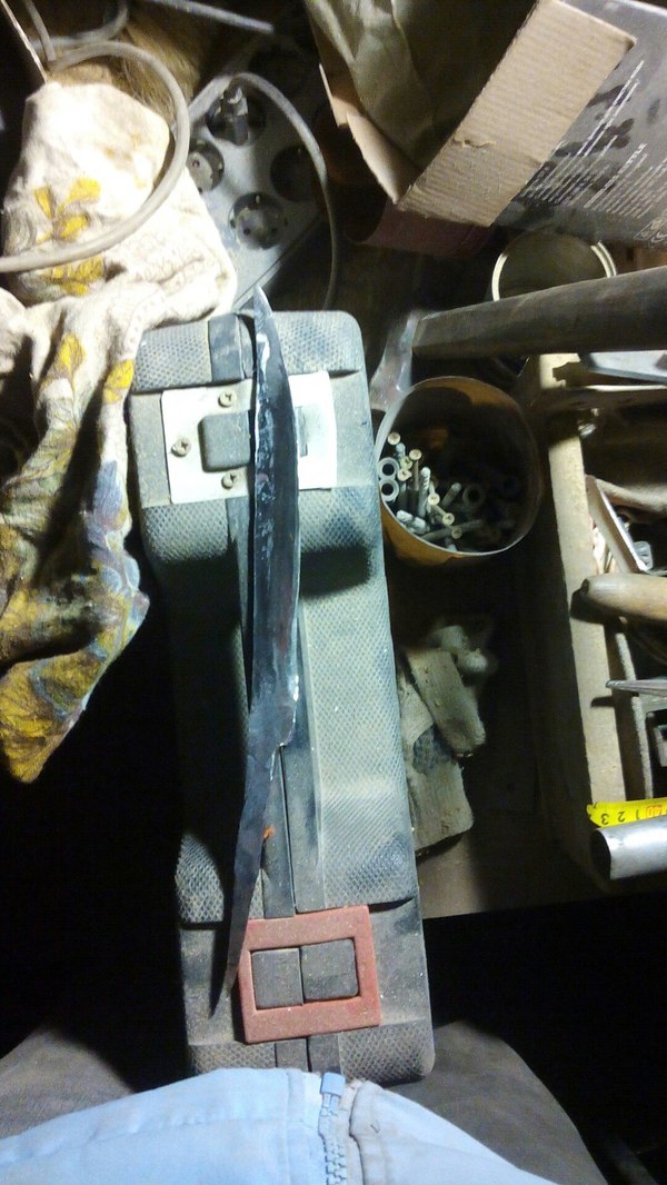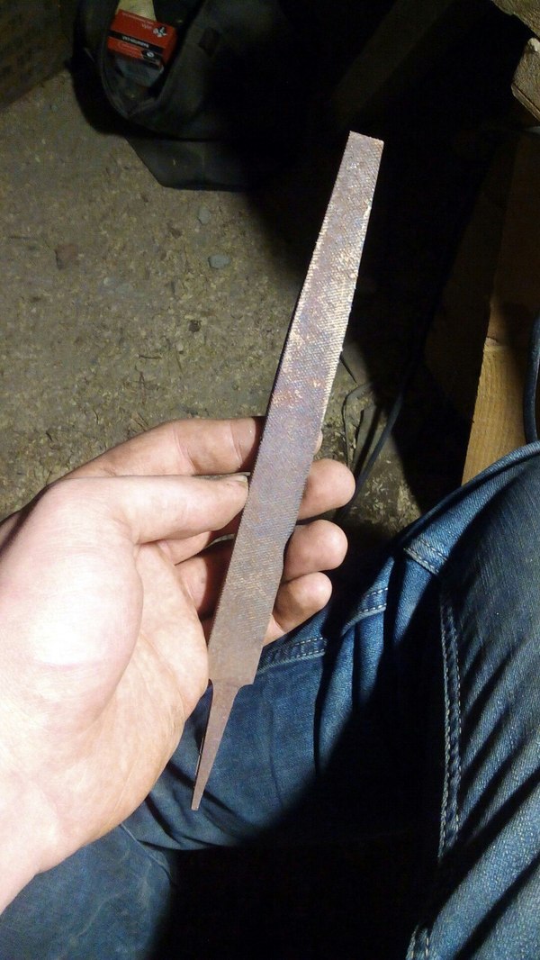 Сперва не собирался ничего делать конкретного. Просто хотелось попробовать - а как это, расплющивать раскаленную железку молотком? Нашёл старый ржавый напильник, который не жалко было портить, да и засунул в печь поглубже. Подождал. Достал плоскогубцами. Красный, даже очень. Положил на кусок какой то железяки, вроде деталь от советских тисков, тяжёлая, ровная более менее, пойдёт, подумал я. Постукал молотком. Че то вроде маленько помял напильник этот. Разжег печь пожарче, сунул напильник подальше в угли. Побродил минут 15. Достал. А он ещё сильнее раскалился. На вид - градусов 700 - 800. Для ковки мало, но я ж чисто побаловаться. И давай молотком мутызгать. Импровизированная наковальня неудобная, напильник из плоскогубцев норовит выскочить, молоток кривой. Руки тоже. Но, блин!... Напильник то поддается потихоньку, форму меняет. Начал пробовать придать форму. Напильник остывал очень быстро, а грелся долго. Но мы ж не ищем лёгких путей. Пришло в голову попробовать сделать заготовку под нож. Ну и начал обстукивать.