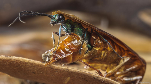 Когда паразитические наездники птеромалиды готовы к размножению, самка находит таракана, который будет выполнять функцию живого инкубатора для ее потомства.
