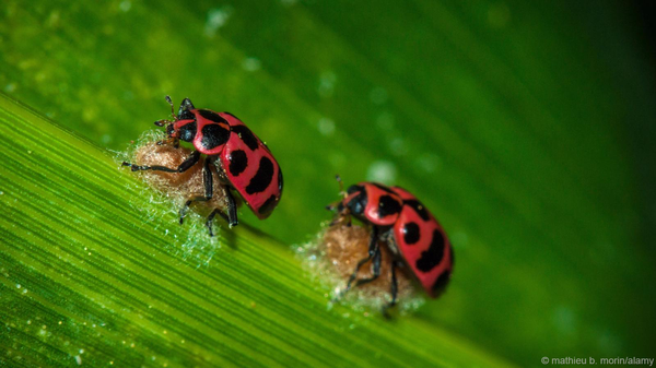Поэтому чаще всего их можно встретить на божьих коровках. Развитие паразита происходит следующим образом: личинка закрепляется между лапок божьей коровки, развивается и создает кокон, превращая божью коровку в своего телохранителя – несмотря ни на что, она будет все так же защищаться от хищников. Затем личинка перегрызает ноги своей защитнице, обездвиживая ее, создавая возможность для развития куколки.