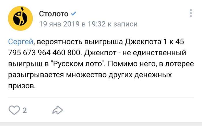 Реклама компании Столото врет нам на каждом шагу, говоря что выиграть может любой билет, это не так шанс или ноль или 22 квадриллиона , при шансах 1 к нулю думаю объяснять не нужно что не выиграет никто, а вот при шансах 22 квадриллиона, попробуйте спросить компанию Столото, напечатала ли она на каждую игру РЛ все комбинации в билетах все 44 квадриллиона билетов(полей два -верхнее и нижнее). Столото не ответит на ваш вопрос и уйдет от ответа. Я считаю это обманом и нечестной игрой. Именно по этому создана петиция о закрытии лотереи Русское Лото, т.к. компания Столото испортила её своими изменениями. Ни в одной лотереи мира нет таких цифр как шанс выигрыша приза, супер-приза равному нулю или 22 квадриллионам, в каком то смысле Россия уникальная страна, в которой есть лотерея с невозможным шансом на выигрыш.
