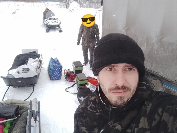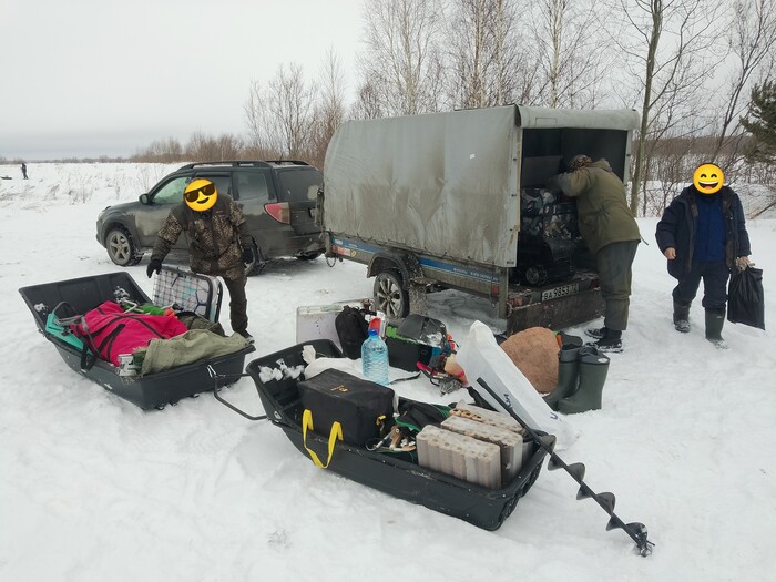 Машина, прицеп, снегоход, палатка, спальники, бензобур, печь, дрова, жерлицы, вода/еда на 2 дня и что-то там еще, всё не упомнишь.