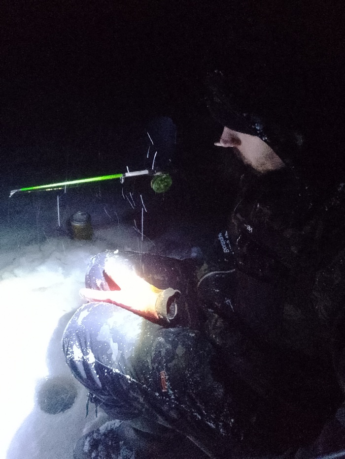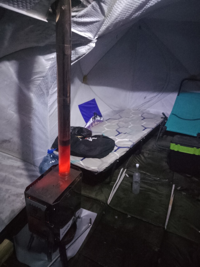 Днём щука, ночью налим. В палатке жара как в бане. Улов сказали в этом году хреновый (всего вышло 16кг рыбного фарша), но зато тепло -5, в том году было -30 и пальцы замерзали, пока меняли живца.