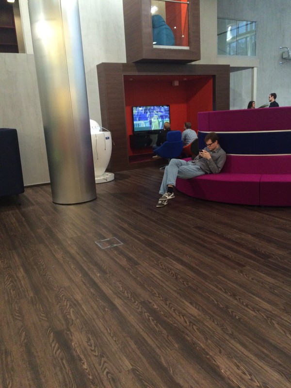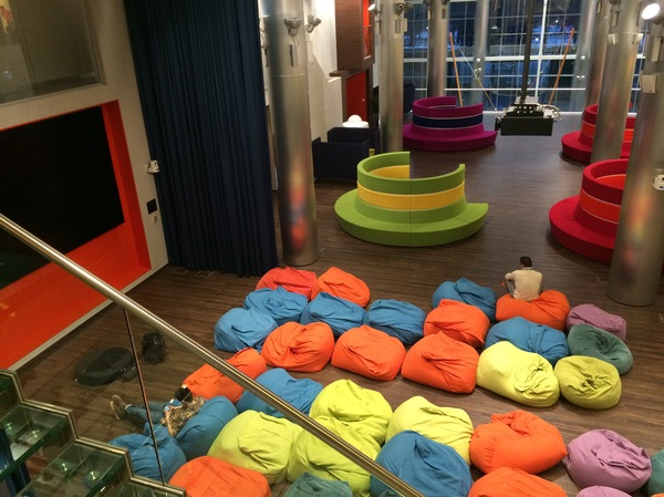 Дальше видим место для отдыха и развлечений. Можно посмотреть ТВ или поиграть в приставку, полежать на кресле-груше или выпить свежевыжатый фреш. Есть приставки и пара теликов, бесплатный вай-фай во всем здании.