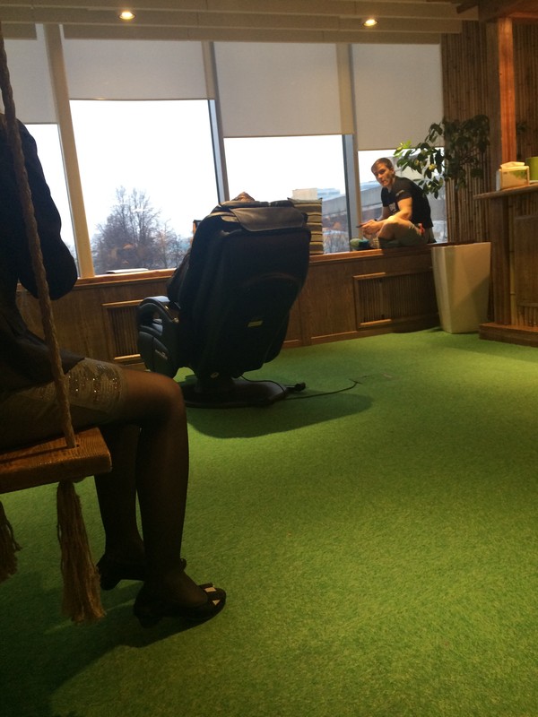 Массажные кресла с видом на Ленинградку и окрестности. Можно посидеть на качелях.