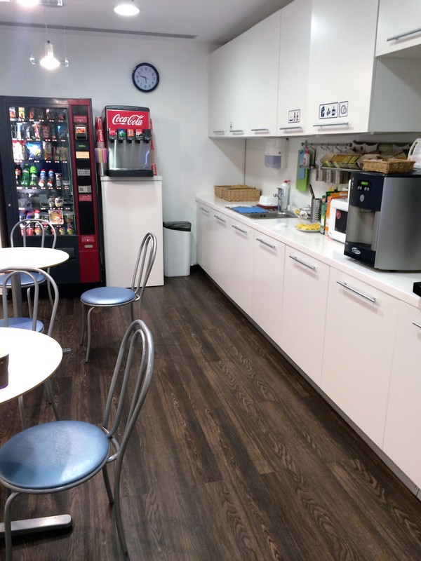 На каждом этаже - кухня, где можешь налить себе колу, печенье или выпить кофе с автомата. Есть чай, лимон, хлопья, хлеб..короче подкрепиться между работой можно, и мой внутренний еврей первые дни потирал ручки.