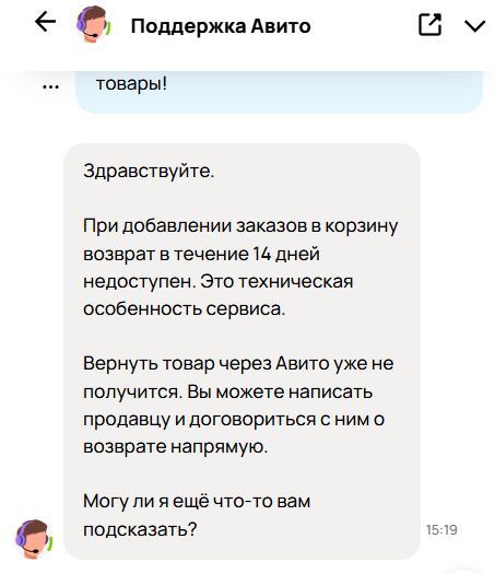 Решил себе и хорошему знакомому обновить добавить видеокарты в свои ПК*шники. Полноценные видеокарты нет возможности купить, да и не игроманы совсем - сидим на встроенных в процессор видео уже давным-давно. Посмотрели варианты и выбрали тот который давал гарантию проверки 14 суток...именно этот пункт был в приоритете. Без проверки другие варианты в принципе не рассматривали. Пара штук майнинг видеокарт... риск очевиден. В корзине Авито было написано, что в случае проблемы с одним товаром - вернуть придется весь заказ. Никаких других уведомлений. Продавец же сам четко подтвердил гарантию в 14 суток.