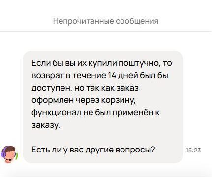 Написал в поддержу...те сразу бортанули раз за разом...они всегда и везде правы без апелляционно в принципе. Когда оформляли заказ мы точно помним, что было предупреждение лишь о том "если часть товара будет возвращаться, то возврату подлежит весь заказ." как-то так. Никаких больше предупреждений или нюансов что защиты НЕТ в принципе при заказе с корзины.