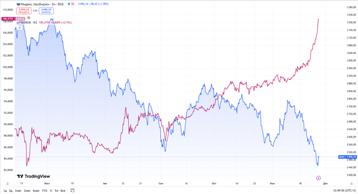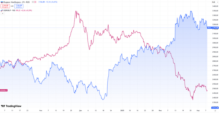 Тогда я это подкреплял вот таким графиком, где красная линия это курс доллара, а синяя - индекс российских акций:
