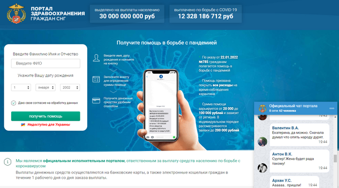 Сайт выглядит вполне прилично, куча информации для видимости, инструкции по борьбе с ковидлой. Есть якобы защита от вирусов лабораторией К. В углу псевдо чат где посетители будто бы общаются и делятся эмоциями от получения выплаты.